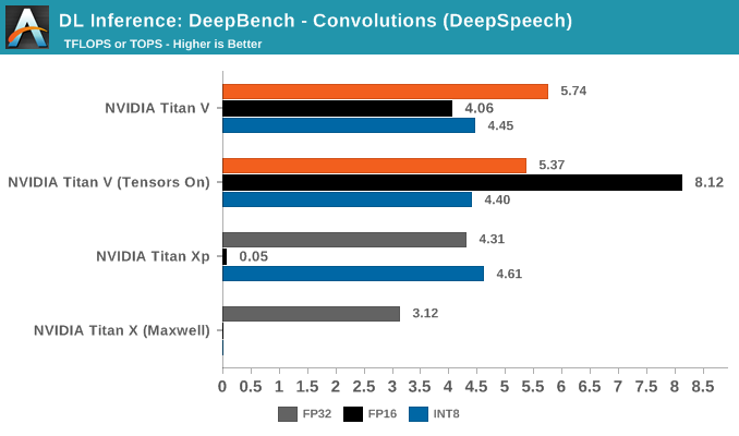 Titan V和Titan Xp均拥有4倍于INT32的INT8性能,DeepBench的INT8推理测试正中Pascal引入的DP4A矢量点积能力之下怀。Volta同样拥有这一能力,在指令集中二者均显示为IDP和IDP4A。