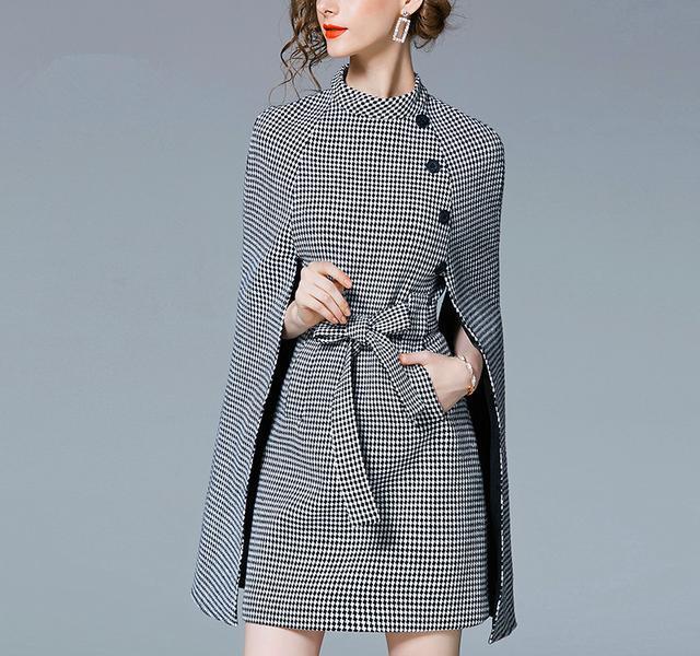 气质干练的OL风鹿歌连衣裙,让你在职场上大放光彩,工作一帆风顺。这是一款假两件连衣裙,斗篷式的拼接,优雅端庄,千鸟格印花,冲击视觉显得很时髦个性,斜纽扣设计,腰间有收腰带和口袋。