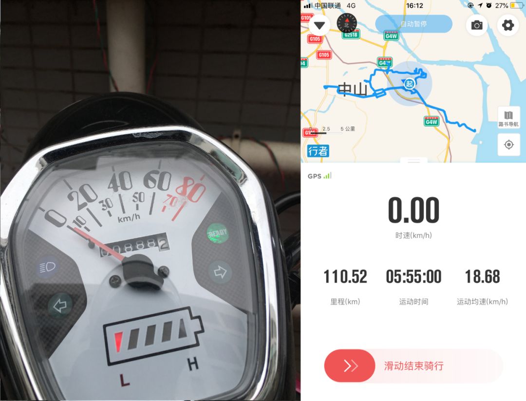 没错,就是官方给的3000米,这个时候车子已经快断气了,最后到家充电的时候里程表为888,行者记录为110km。
