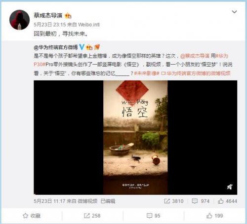 上周,由蔡成杰指导、华为P30 Pro手机拍摄的微电影《悟空》,在微博上被大量播放、转载。