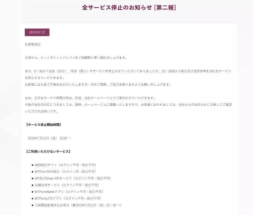 据悉,7月11日,BITPoint Japan交易所遭遇黑客攻击,随后交易所发布公告称,将停止包括加密货币转入/转出、交易和发送、接受款项在内的所有服务,服务恢复日期将另行公布。
