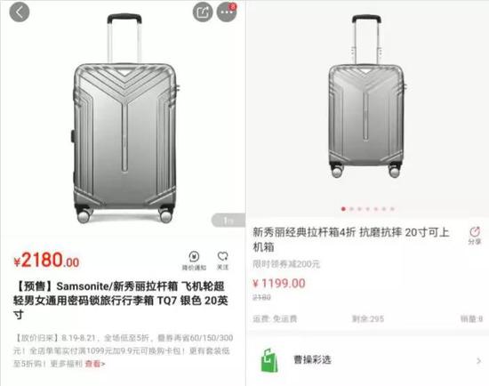 记者点击出行分类下的行李箱选项,查看到一款银色的新秀丽20寸经典拉杆箱,价格为1199元,满1000元还可以使用200元的券,那么最终价格在900元左右。而记者又同时到其他电商平台查看同款产品价格却在2180元左右。