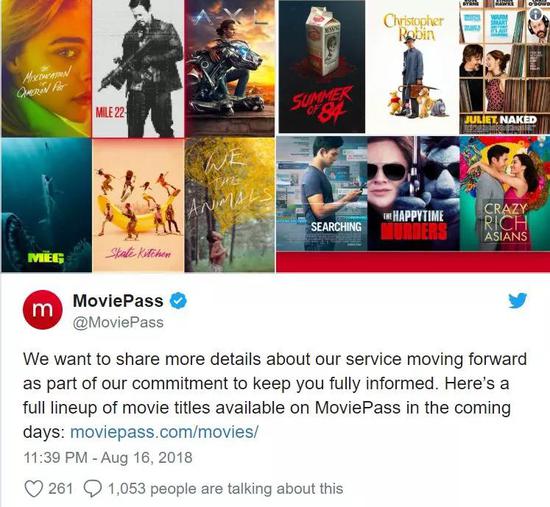 8月,MoviePass宣布不再出售“无限量”计划,改为每月三张免费电影票;