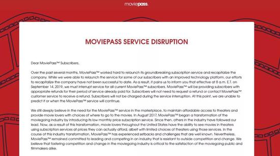 2019年7月,MoviePass停止吸收新用户;9月14日,公司正式发布声明,宣布停止服务。