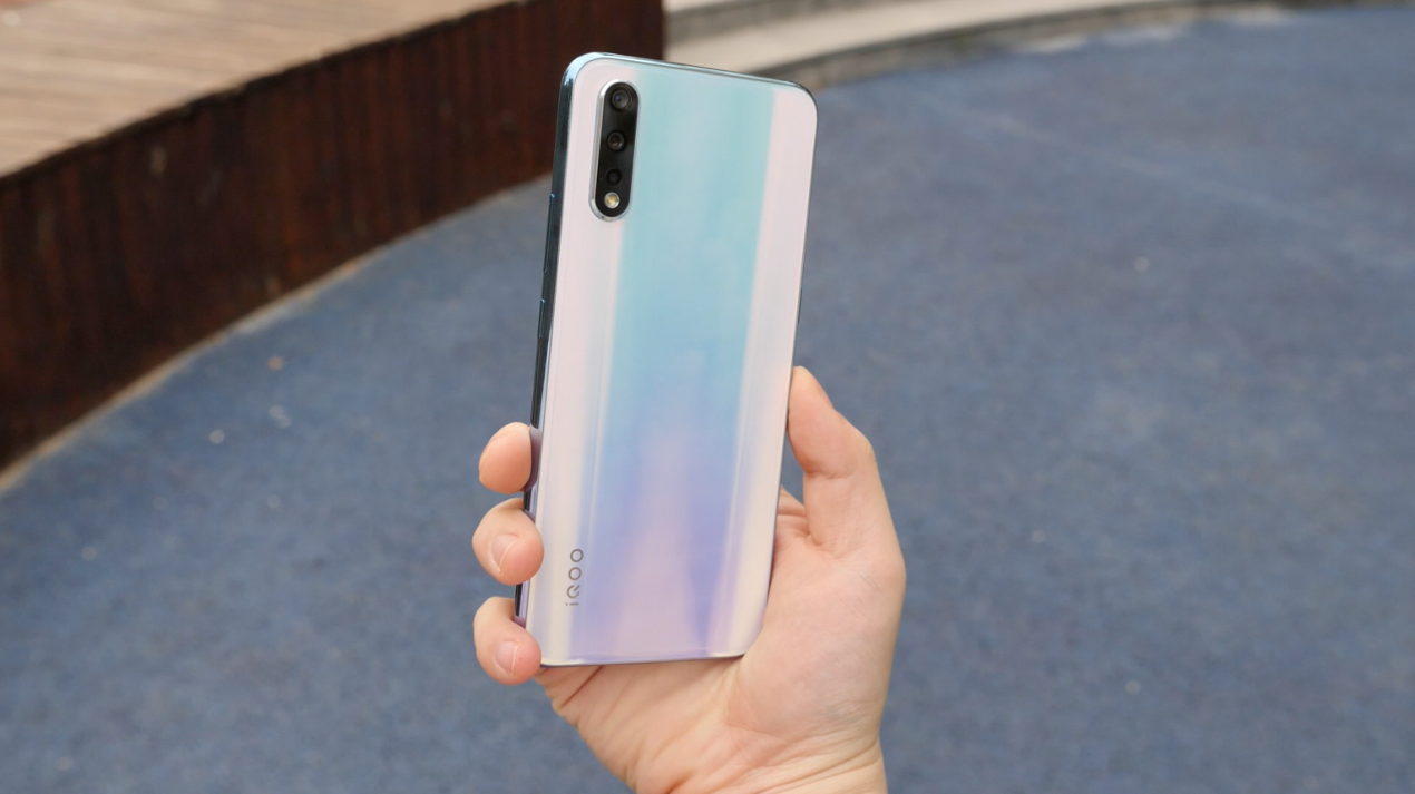 iQOO Neo 855版整体外观依旧采用iQOO品牌那种颇有力量感的家族设计,造型依旧偏方正,不过这次首发在配色上不再全线硬朗,除了家族标配的碳纤黑,还加入了电光紫和冰岛极光两个配色;我们手中拿到的冰岛极光配色以白色打底,配合蓝紫色的光线渐变,相比碳纤黑确实没有那么硬朗了。