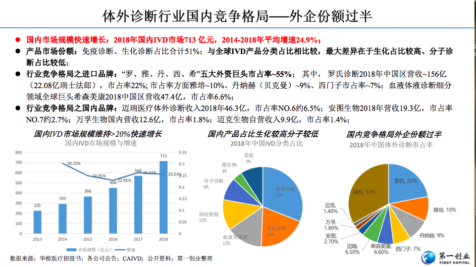 但国内IVD行业起步晚,仍处于追赶行列。 目前国内IDV行业还是被海外四巨头垄断——罗氏诊断、雅培、丹纳赫、西门子在2018年占据了国内IDV约49%的市场;而国内市场份额前四名迈瑞医疗、安图生物、万孚生物、迈克生物的市占率仅有11.4%。