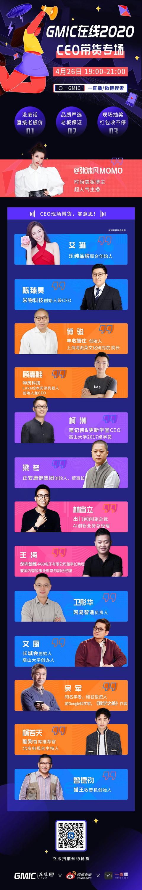 GMIC在线CEO带货专场将在4月26日晚19:00-21:00惊喜呈现,十余位企业CEO现场“破圈带货”,没废话,直接老板价!
