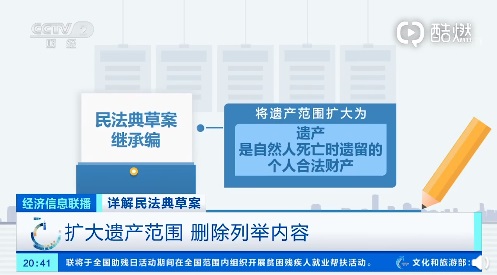IT之家了解到,此次民法典草案继承编对继承遗产的范围做了改变,将《继承法》中遗产范围,公民的收入、房屋、林木、文物、著作权等一一列举的方式删除,将遗产范围扩大为“遗产是自然人死亡时遗留的个人合法财产”,立法上采取了概括的方式,只要是自然人合法取得的财产,都属于遗产,可以被继承,最大限度地保障私有财产继承的需要。