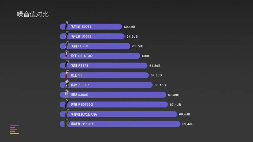 我们按照国标的方法测定了各家的噪音水平。结果不出所料,旋转式整体噪音值低于往复式,其中表现最优秀的就是飞利浦 9 系。它的噪音水平在数值上看并没有比其他产品好太多,但是我们试用时,觉得它声音质量优势还是挺明显的。