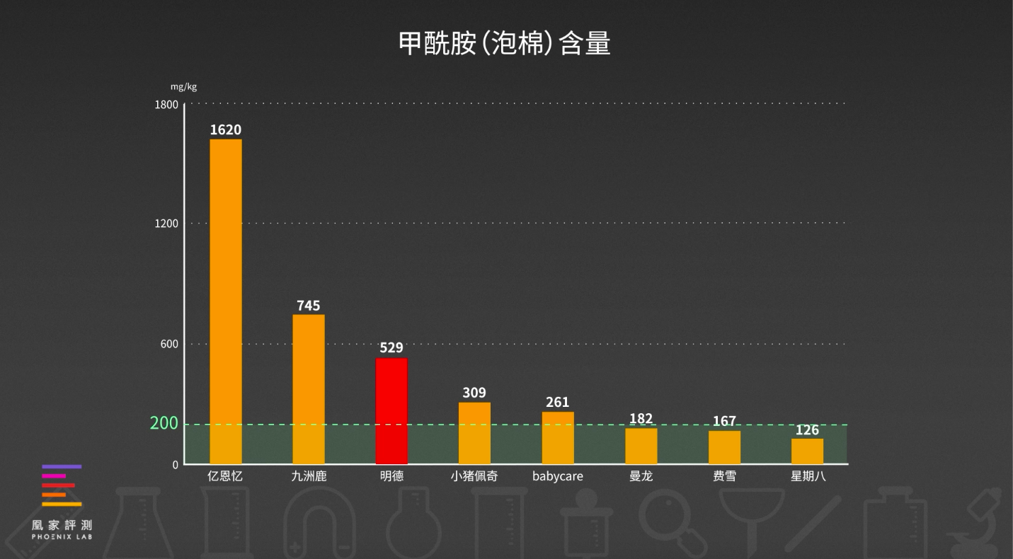 更讽刺的是,我国儿童爬行垫团体标准中,其实规定了甲酰胺的限量值,而作为团体标准的起草者之一,明德这个品牌自己的产品就超标2.6倍,我建议厂家的责任人自己给自己几个大嘴巴。