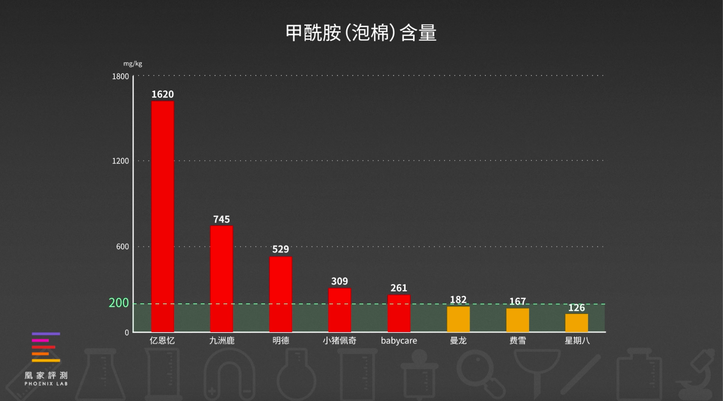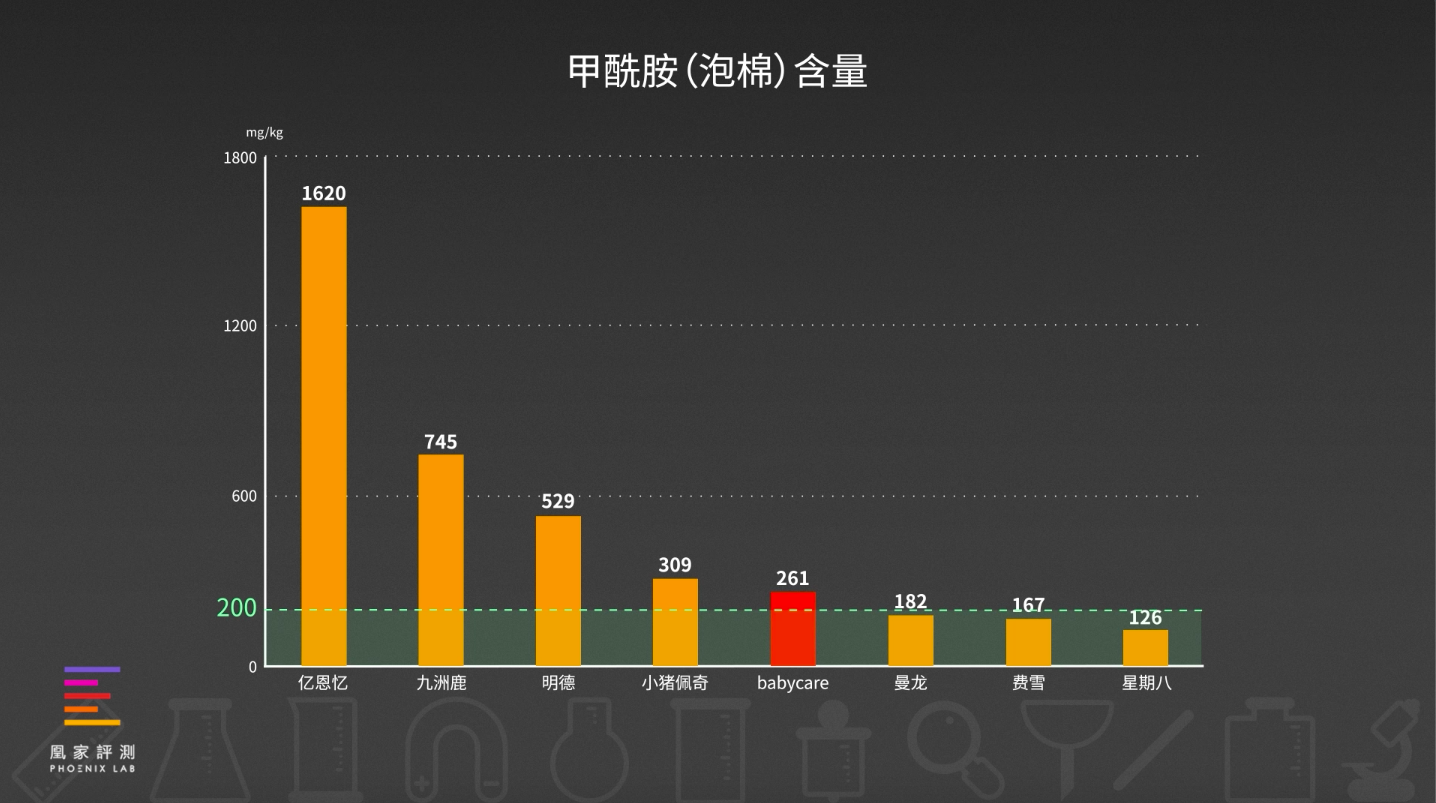 结果比我想象的更可怕,8款爬行垫全都检出了甲酰胺,按照200mg/kg的限量值要求,其中有5款产品甲酰胺含量超标。