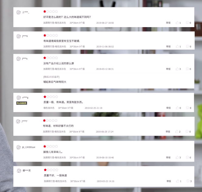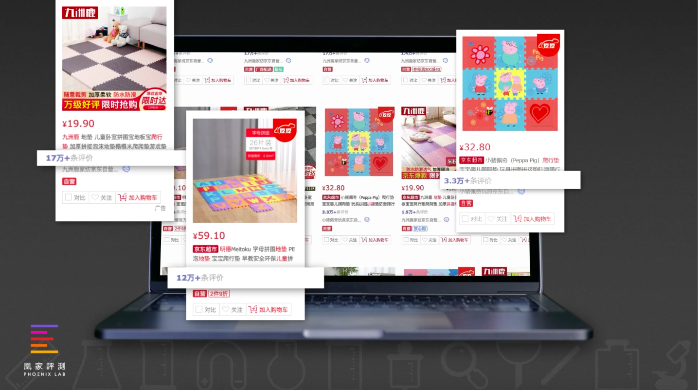 其它几款超标产品中,单看评价数量,九州鹿有17万,明德有12万,就连小猪佩奇也有3.3万评价。很难想象,我们周围到底有多少孩子在使用这样危险的爬行垫。