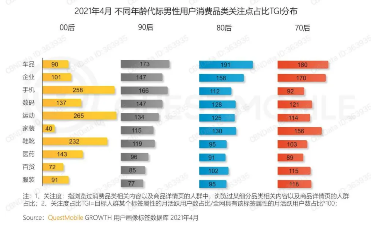 根据QuestMobile发布的《2021男性消费洞察报告》,00后年轻用户对于手机、运动以及鞋靴等偏悦己类商品更加关注,随着年龄的增长,80、70后男性用户消费品类偏好趋同,集中在汽车用品、办公以及家装等品类。仔细看运动和鞋靴,消费品类关注点的改变最大,换句话说,消费者年轻时偏向体育消费,而年龄越增长,对体育运动的消费需求就逐渐降低。