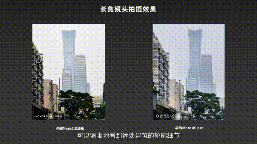 对比同样有着10倍混合变焦的Mate40 Pro, Magic3至臻版的6400万像素长焦在画面清晰度上明显更占优势,能够清晰的看到建筑物的更多细节。