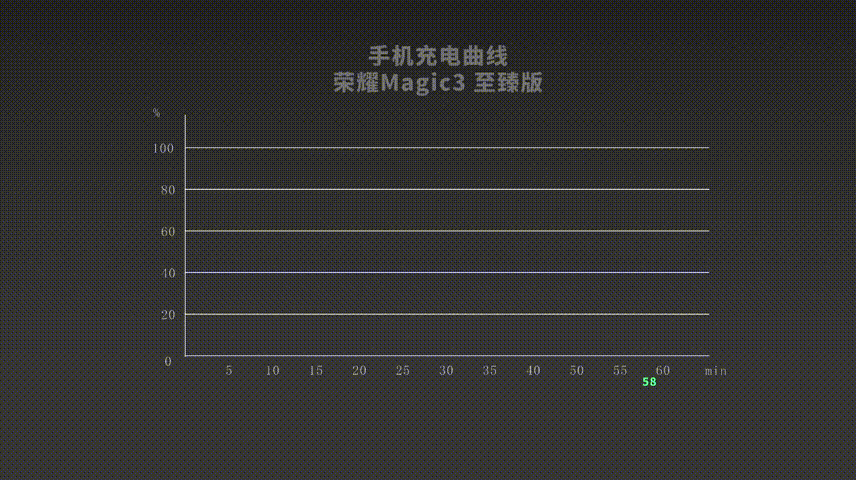 在充电上,Magic3至臻版支持66W有线超级快充和50W无线超级快充,我们测试了有线快充,半小时能充55%的电量,充满需要58分钟。