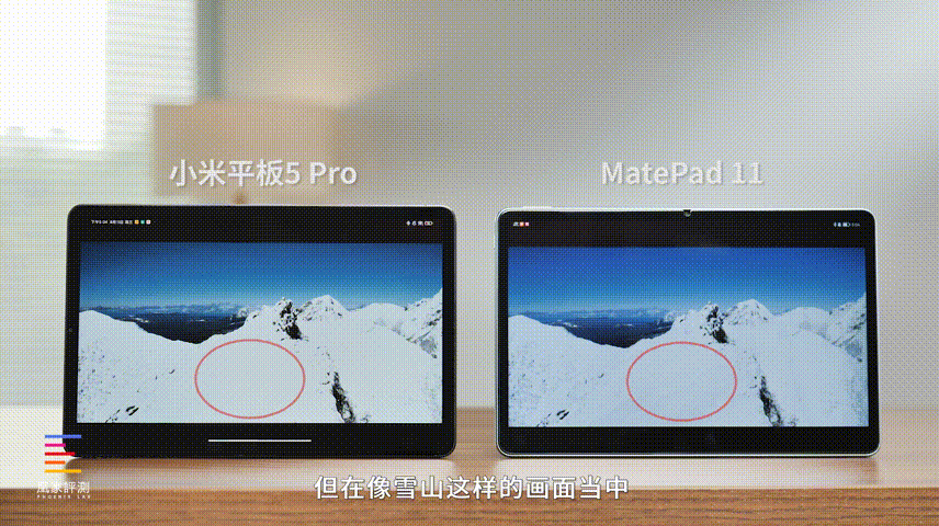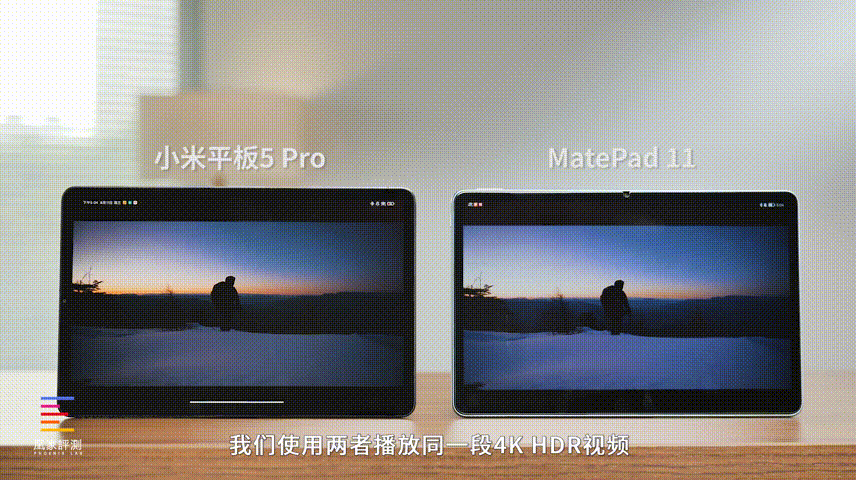 与同样支持 10bit 色彩显示的 MatePad 11 相比表现如何呢? 我们使用两者播放同一段 4K HDR 视频,可以看出小米平板5 Pro 的色彩显示更加准确,夕阳以及云朵的色彩都被很好地展示出来。