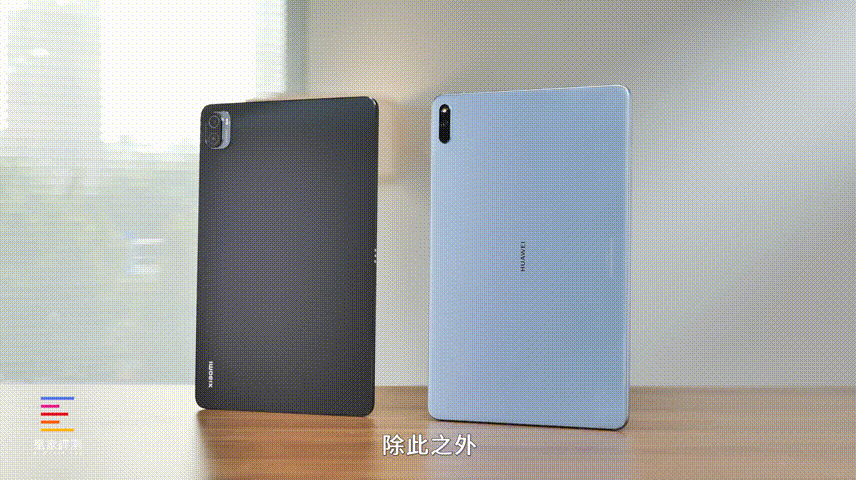 在机身背面,小米平板5Pro 采用了与小米11 同款造型的双摄镜头模组,相比只有一颗摄像头的 MatePad,整个镜头模组会更大。