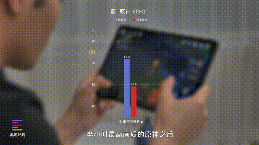 半小时最高画质原神之后,小米平板5 Pro 平均帧率 53.8,帧率波动28.6,整体表现不错。