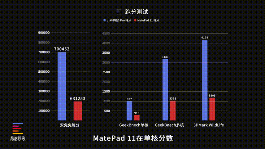 MatePad 11 在单核分数以及 GPU 得分上偏低,多核得分优势不大。