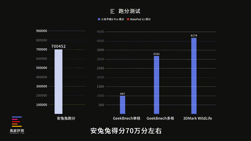 小米平板5 Pro 安兔兔得分 70 万左右,GeekBench5 单核得分 997,多核得分 3181,3D Mark Wild Life 得分 4174,整体表现处于 870 的平均水平。