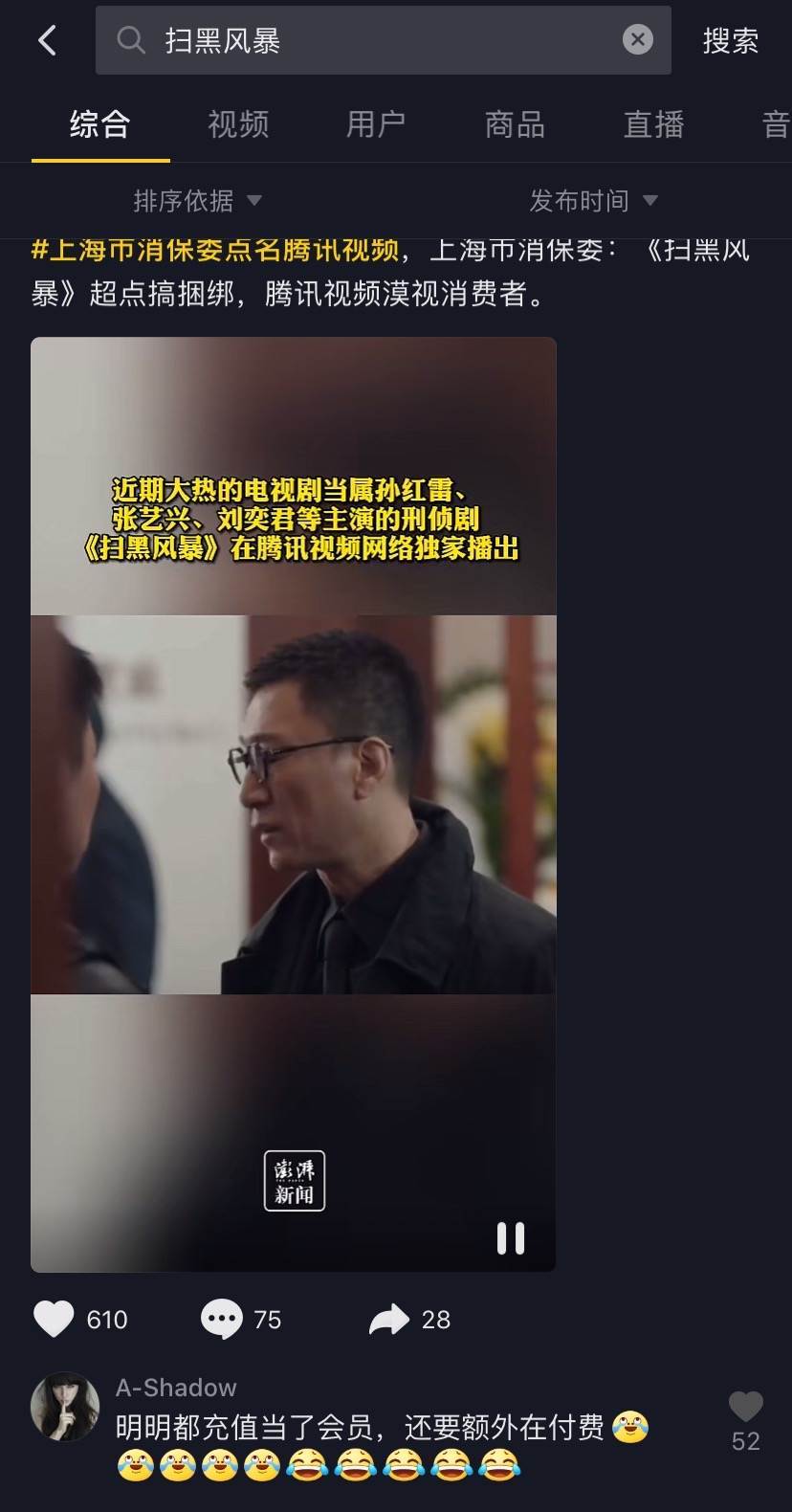“还好我没有花钱点映,抖音都剧透完了。”腾讯视频会员李真真表示,由于有腾讯视频VIP会员权利,她始终要比电视抢先看五集,但在犹豫要不要超前点映时,却发现抖音上有许多《扫黑风暴》的剧透视频。