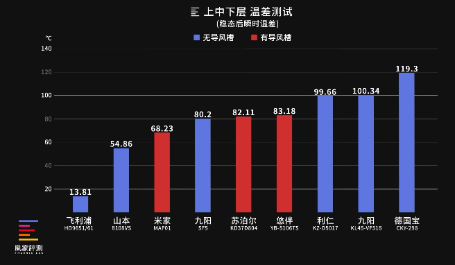 不过,最有意思的产品是山本,和其他的炸锅上中下三层温度递减不同,它温度最高的竟然是下层。最大温差则是下层和中层之间,有54.86度。所以,在高温模式下,主要起加热作用的是它的烤盘。