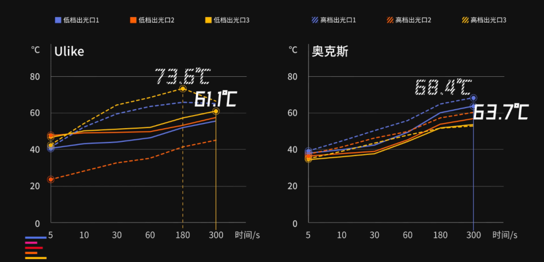 在温度控制上表现最好的是Ulike和奥克斯,在连续使用5秒后,低档、高档温度都控制在了50℃以下,连续使用5分钟,这两款产品出光口最高温也控制在了74℃以下,不用担心会过热。