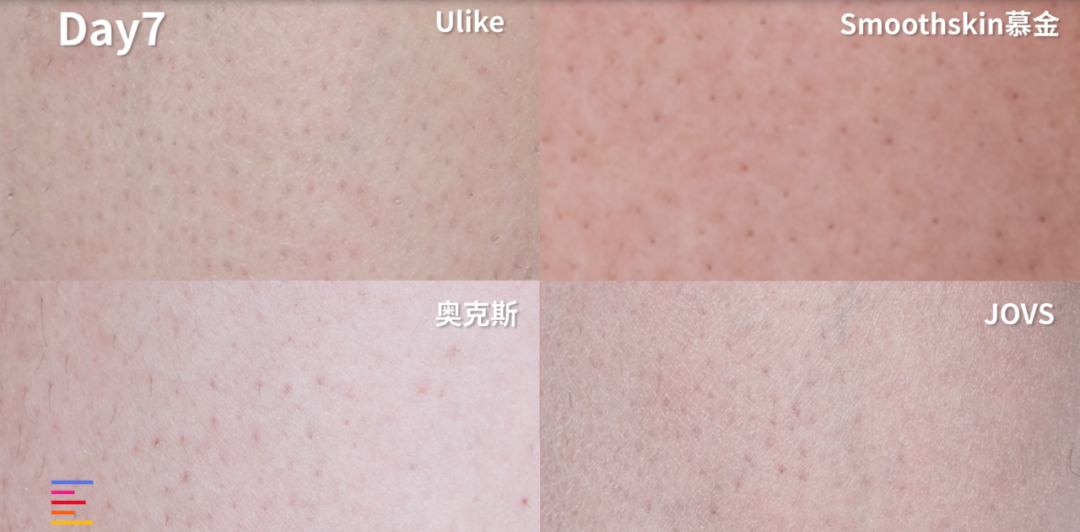但是7天以后,差别就比较明显了。使用JOVS和奥克斯脱毛仪的两条腿,肉眼已经可以看到比较明显的毛发了。使用Ulike和慕金的腿部,整体看上去很白净,但在相机的特写下,也能看到冒出来的小毛茬。