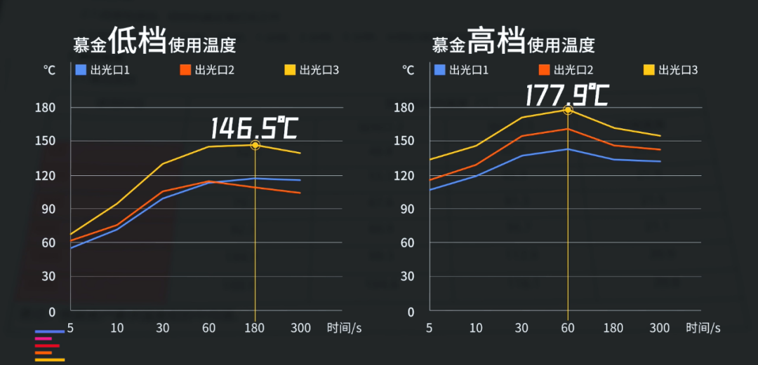 不出所料,慕金低挡的温度都达到了146.5℃,而高档的最高温度达到了177.9℃。