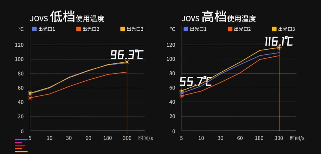 为什么同样有冰点技术,JOVS的温度就更高呢?其实刚才我们就说了,JOVS只有四周金属部分会制冷,但长时间使用时,中间出光口的温度,还是很难做到有效控制。