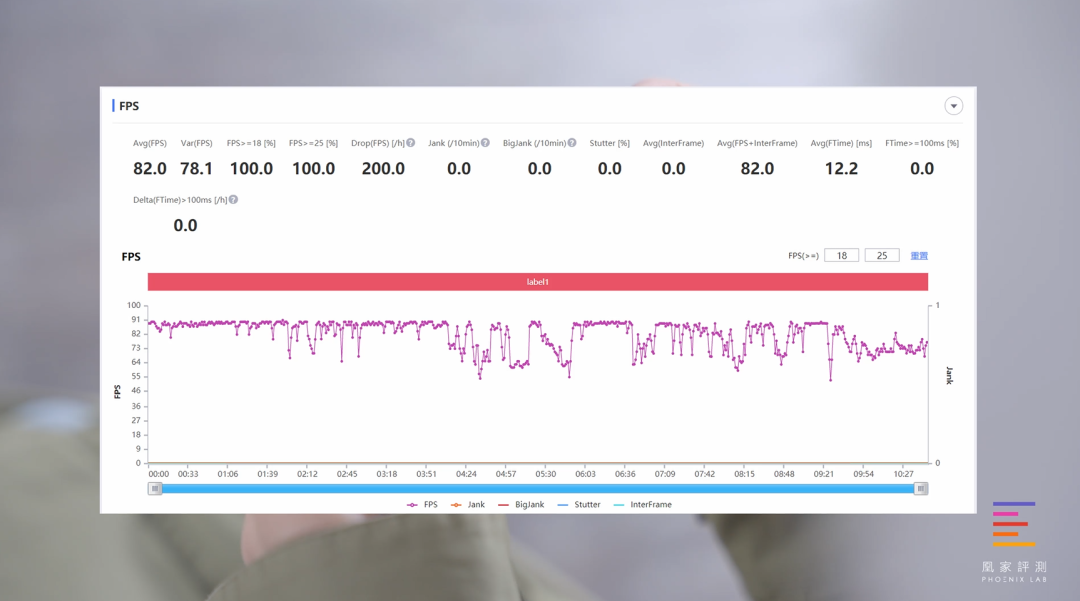 和平精英开启90帧模式,玩一局下来平均帧数82,帧率波动78.1,掉帧情况有些明显。