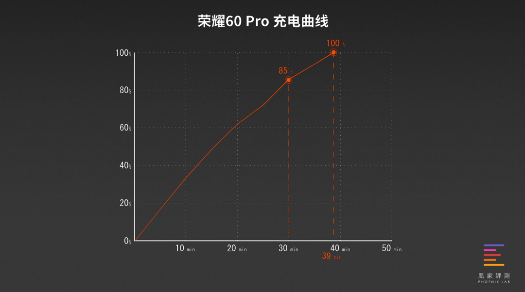 荣耀60 Pro在机身厚度并没有增加很多的情况下,电池增加到了4800mAh,但是快充从100W降到了66W快充,依然不支持无线充电。在测试中,半个小时能充满85%的电量,充满需要39分钟。