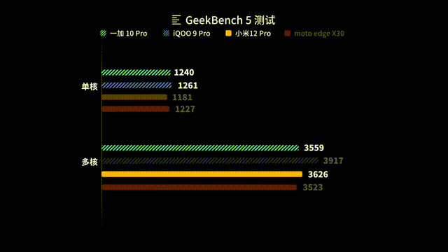 CPU单核仅次于iQOO 9 Pro,多核成绩则跟小米12 Pro相近,GFXBench测试中曼哈顿3.1离屏的结果存在异常偏低,其他跟iQOO以及小米处于相同水平。