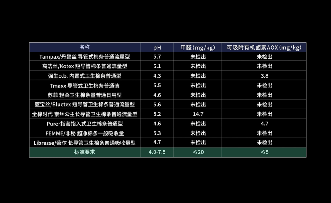实验室给我们测试了微生物、pH 值、甲醛、可迁移性荧光物质以及可吸附有机卤素(AOX)这五项安全指标。 先说一下结论:根据正在起草的棉条国标,10个品牌在安全性上全部过关,有害物质含量均在国标限值以内。