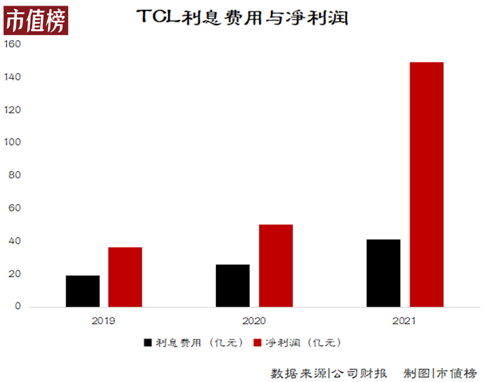 债权性融资则会增加企业的财务负担。2021年,TCL的利息费用高达41亿元,今年第一季度,又付出了10亿元的利息,严重吞噬净利润,让本就不被看好的商业模式雪上加霜。还有一部分利息因为资本化处理,基本不影响当期的净利润,但是会形成现金的流出。