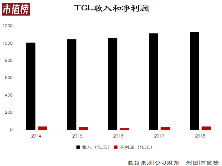 2014年,TCL跻身“千亿营收俱乐部”,随后的2015-2018年,公司营收停滞不前,增幅再也没超过5%,利润还出现了下滑。