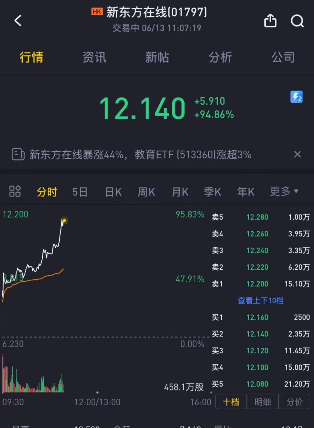 受此影响,港股新东方连续两日直线飙升。6月13日,新东方在线股价盘中实现翻倍,涨幅一度逼近100%,最高达96.80%。