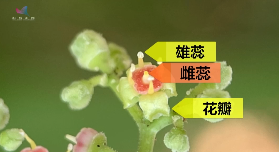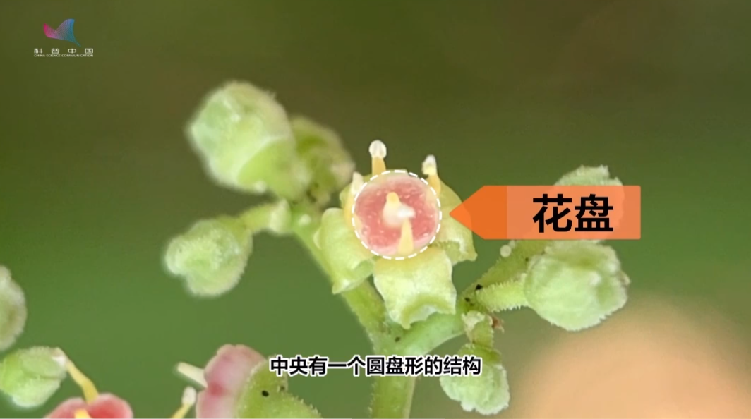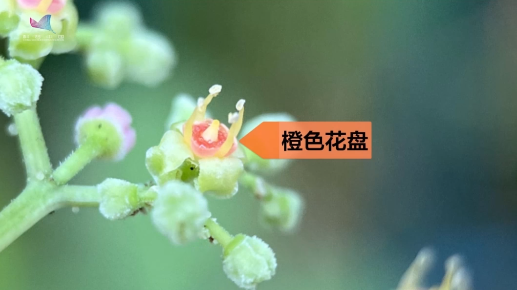 开花当天,4 枚绿色的小花瓣展开,花盘橙色,上面盛满花蜜,摇摇欲滴,特别能吸引昆虫访花传粉,这时的雄蕊已经发育成熟,可以释放花粉,但雌蕊还没完全发育,不能正常接受花粉,从功能上看,乌蔹莓的花在花盘橙色时是雄花。