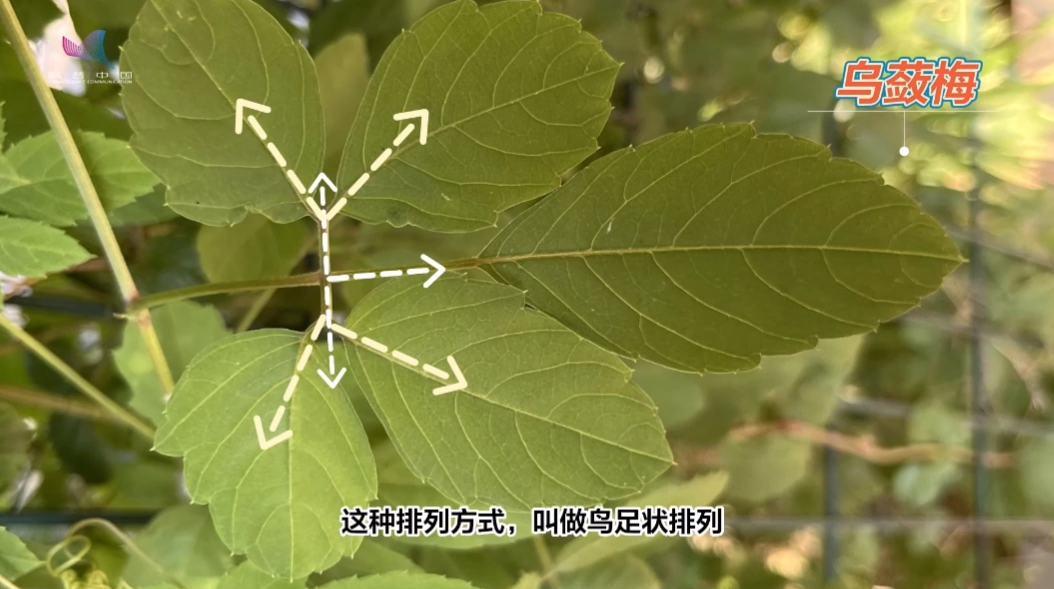而乌蔹莓的叶虽然也有 5 枚小叶,但并不都连在一起,而是先分成 3 叉,左右两叉上再各伸出一片小叶来,这种排列方式,叫做鸟足状排列。