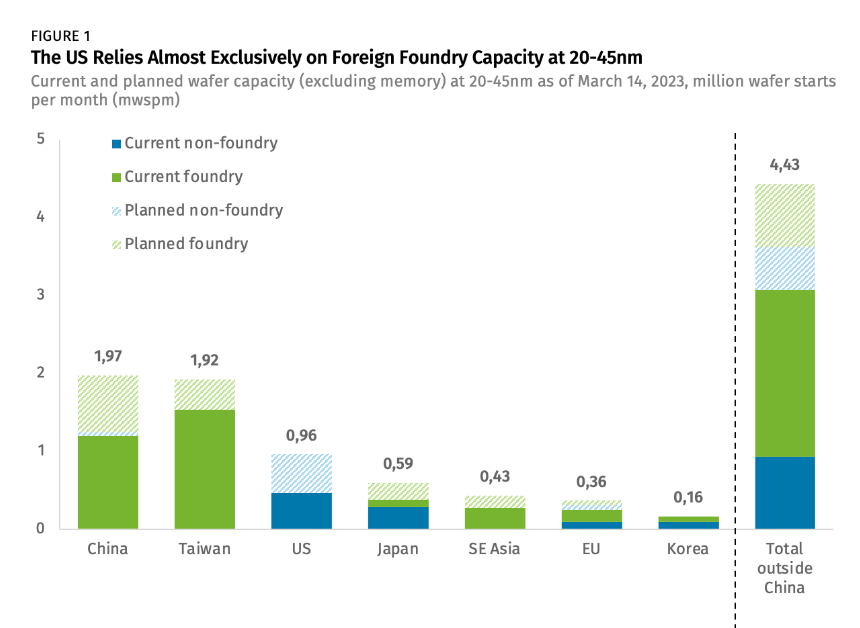 20nm-45nm成熟工艺芯片(不含存储),美国高度依赖海外市场(数据来源:SEMI)