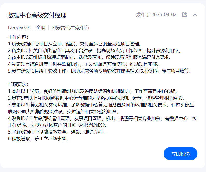 另一岗位“数据中心高级交付经理”则更偏向数据中心建设与交付环节。