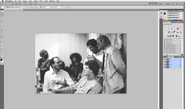 在1990年版PS中打开的一张照片,从左至右分别是:Adobe的创意总监拉塞尔·布朗(Russell Brown)以及艺术家尼古拉斯·卡拉威(Nicholas Callaway)和大卫·霍克尼(David Hockney)