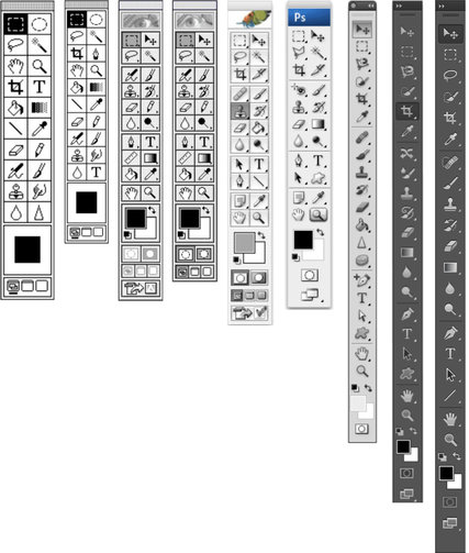 Photoshop的工具栏的新旧版本,从左至右为演化过程,最右为最新版Photoshop CC工具栏